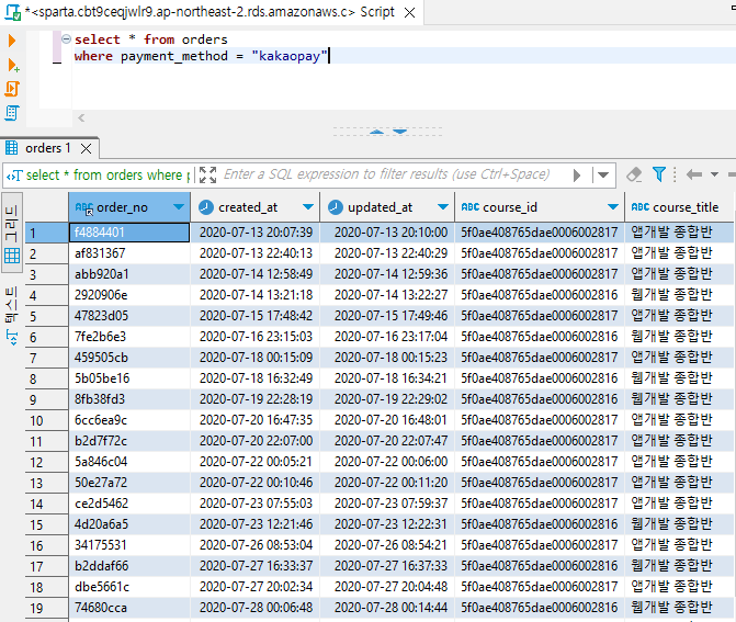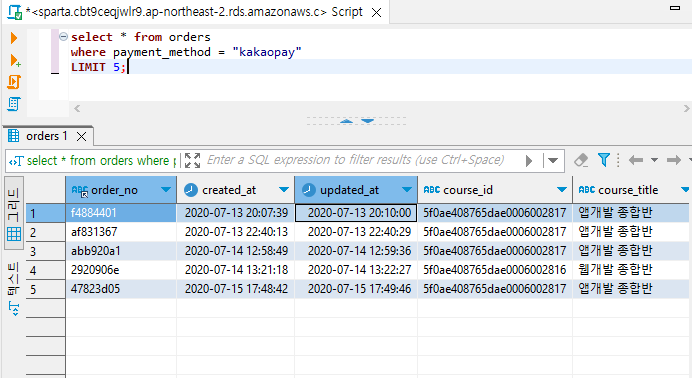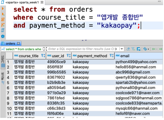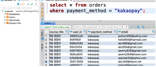 쿼리를 해석해 보면 orders 테이블에서 payment_method가 카카오페이인 데이터를 모두 가져와줘