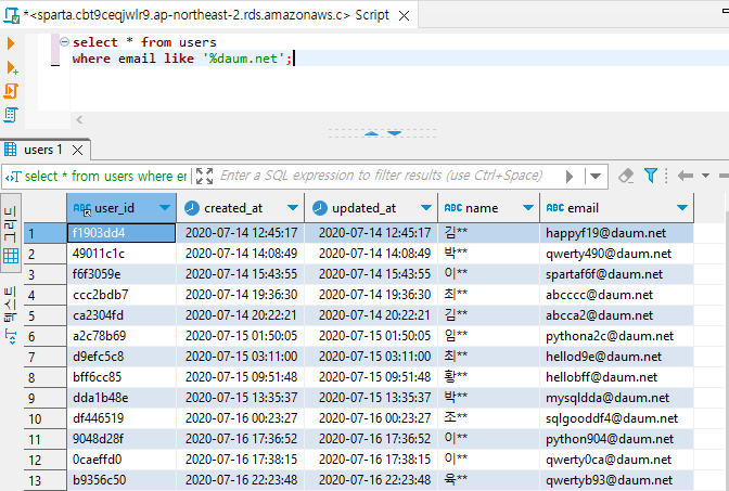 결과를 확인하면 naver 등 다른 이메일 사용자는 나오지 않고 daum 사용자만 가져온걸 확인할 수 있다.
