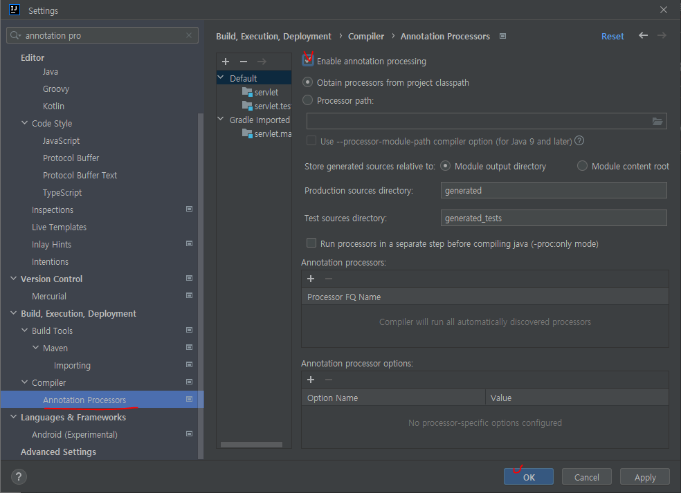 이어서 다음과 같이 셋팅을 해준다. File -> Settings -> 검색창에 annotation processors