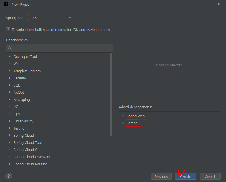 Jar이 아닌 War을 선택해서 생성하겠다. 다음으로는 사진과 같이 Spring Web, Lombok를 선택 후 생성해준다.